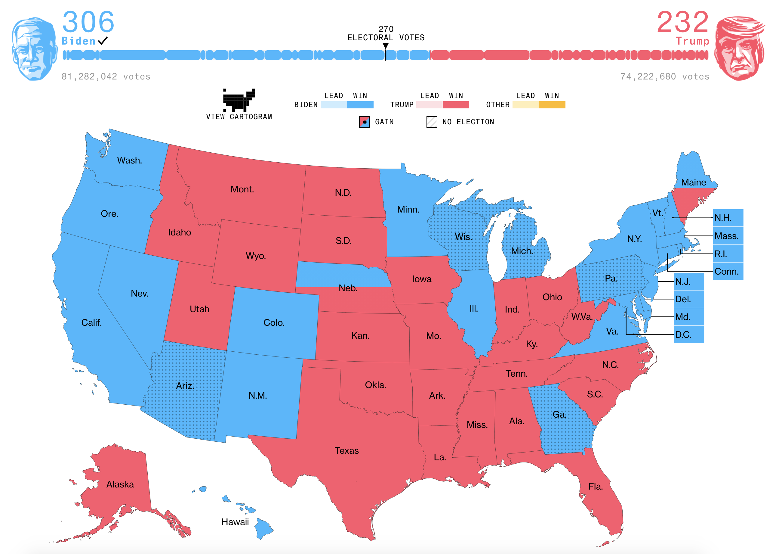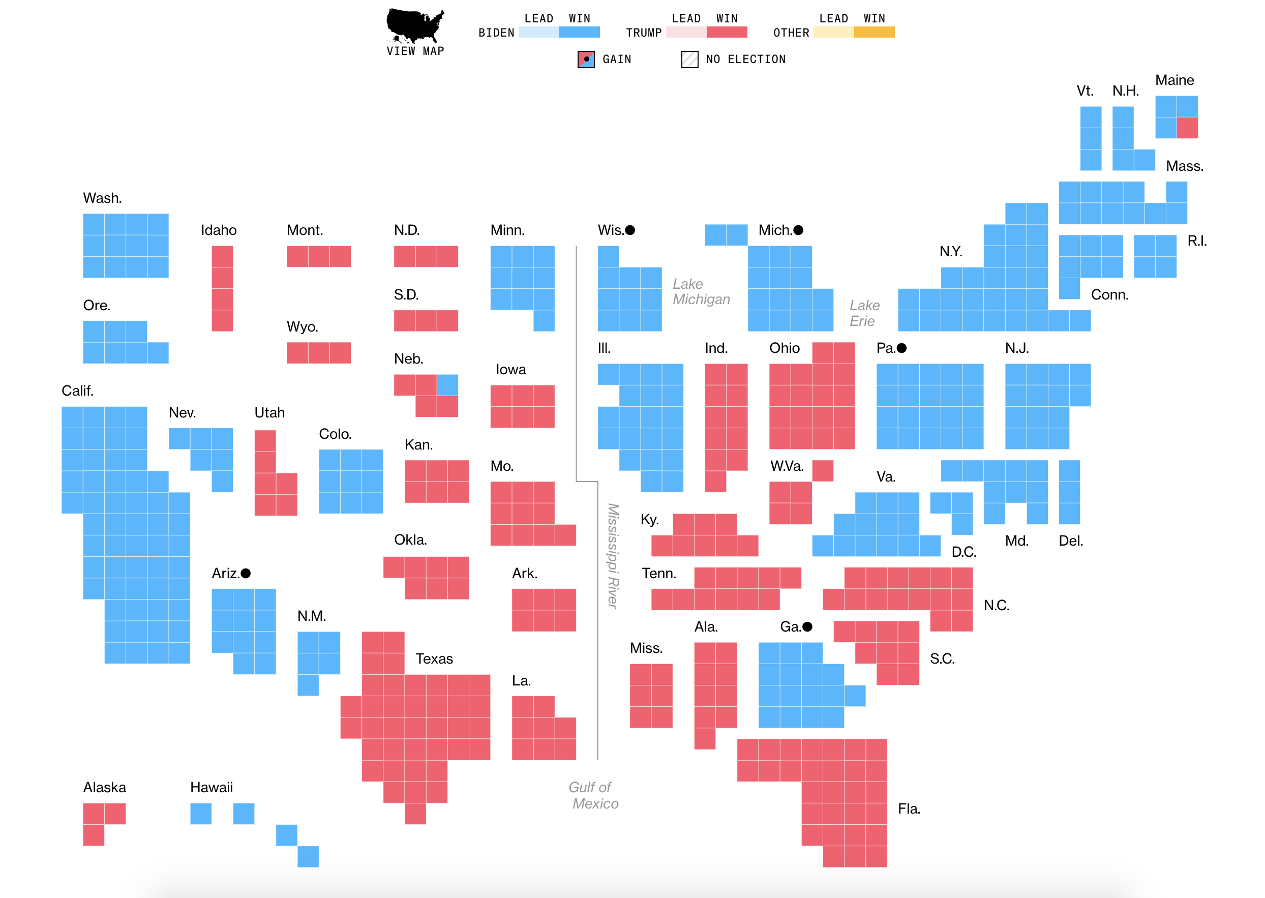 Our 2020 election results featured new cartograms and voter turnout modeling embedded throughout the project.