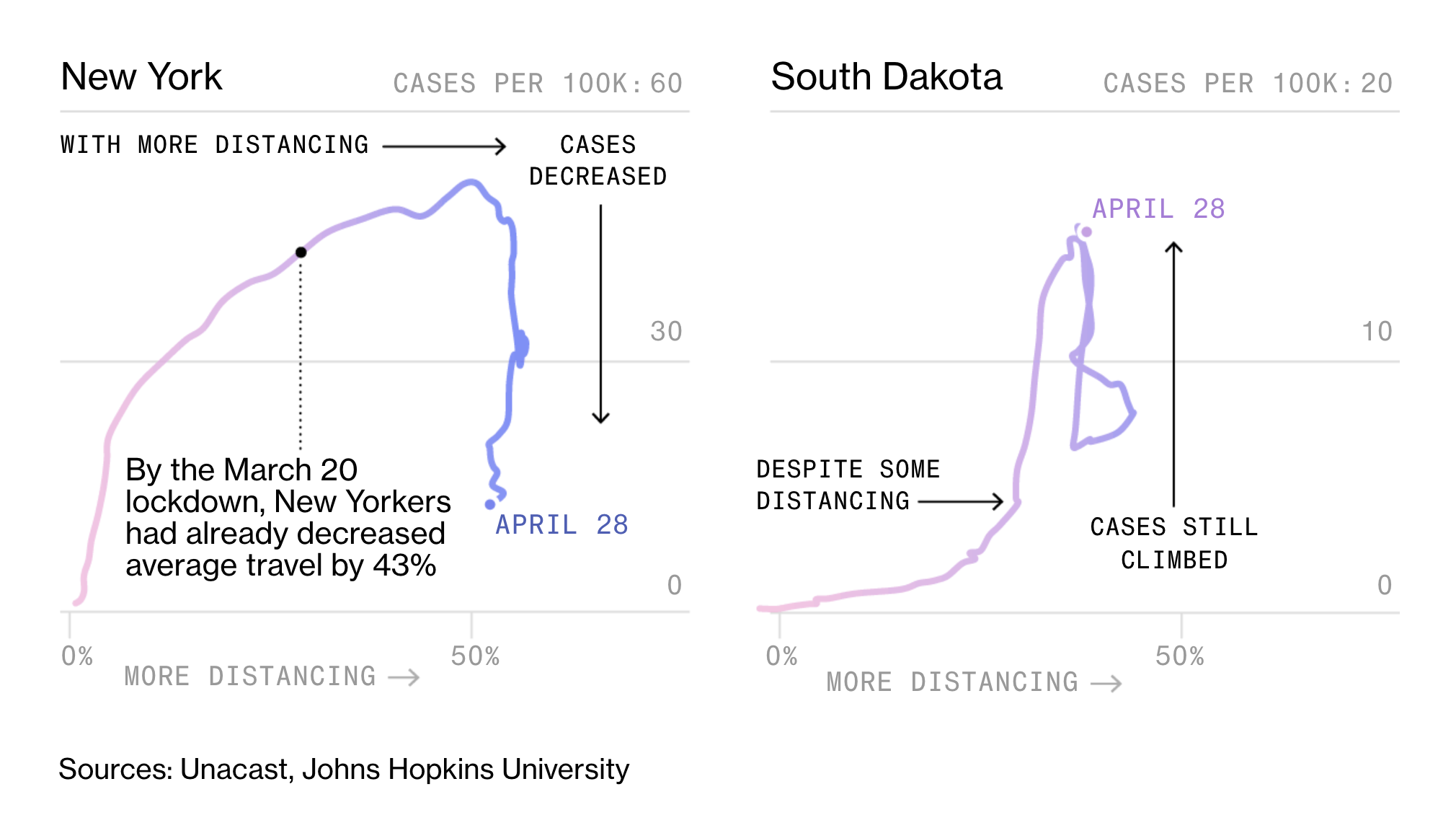 Mapping American social distancing efforts. States with higher percentages of social distancing saw a decline or stabilization in coronavirus cases. View project ︎PITCH, DATA, DESIGN, WRITING, CODE